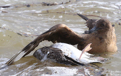 Udazken honetan itsasoko ekaitzek oso gogor aztindu du Euskal herriko kostaldea. Hori dela eta itsaso zabalean bizi ohi diren hegazti ugari kostako lehen lerroraino etorri dira. Horietako bat Marikoi haundia izan da (Stercorarius skua). Bere elikatzeko modurik arruntena beste hegaztiak atzetikan jarraitu ondoren jana bora araztean datza, baino oraingo honetan kostalderaino gerturatu zitzaizkigun Marikoi haundi hauek, goseak larri zauden eta kaio hankahoriei eraso egiten ikusi genituen non nahi. Eraso horietan, batzuetan kale egiten bazuten ere, beste batzuetan kaio hankahoriak hiltzeraino iristen ziren. Marikoi haundiak kaioak akabatzeko modu arruntena, bere mokoarekin kaio hankahoriaren lepaldea ondo estutu ondoren, burua urpera sartu eta ito araztea zen. Baino belar gainean, uretatik kanpora ere ikusi genuen ale bat akabatuta. Beraz, erasotzaileak izatetik erasotuak izatera pasa dira oraingo honetan gure kaio hanka horiak. Irudi gehienak Lapurdiko Angelu herrian, Adur ibaia itsasoratzen den ingurunean ateratakoak dira. Behekaldean dituzue irudi horietako batzuk.